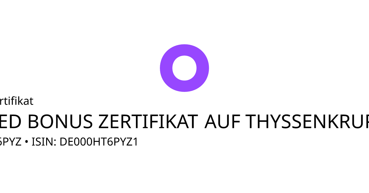 Dieses Capped-Bonus-Zertifikat bezieht sich auf den Basiswert thyssenkrupp AG und hat den Fälligkeitstag am 25.09.2026. Das Produkt ist mit einem Sicherheitslevel von 7,75 EUR und einem Cap von 13,50 EUR ausgestattet. Der Anleger partizipiert unter Berücksichtigung des Bezugsverhältnisses von 1,00 an der Entwicklung des Basiswertes, die Rückzahlung ist allerdings auf maximal 13,50 EUR begrenzt (Cap multipliziert mit dem Bezugsverhältnis). Notiert der Basiswert während des Beobachtungszeitraums vom 11.07.2025 bis zum 18.09.2026 nie auf oder unter dem Sicherheitslevel wird am Ende der Laufzeit mindestens der Bonusbetrag von 13,50 EUR und maximal der Höchstbetrag ausbezahlt.