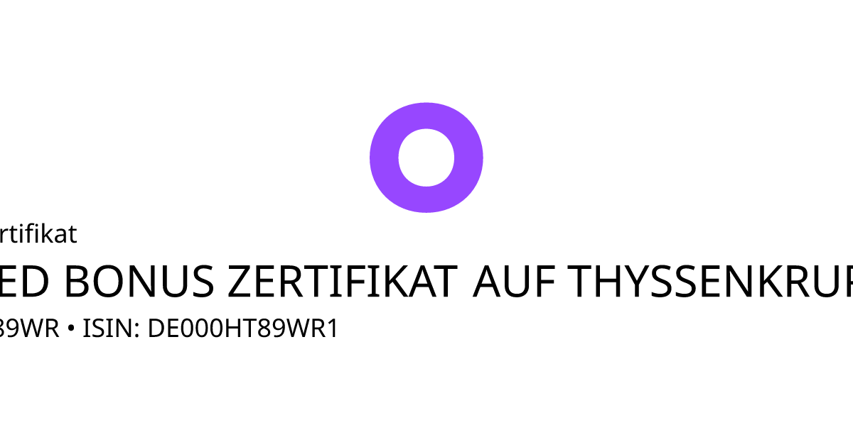 Dieses Capped-Bonus-Zertifikat bezieht sich auf den Basiswert thyssenkrupp AG und hat den Fälligkeitstag am 25.09.2026. Das Produkt ist mit einem Sicherheitslevel von 6,50 EUR und einem Cap von 11,00 EUR ausgestattet. Der Anleger partizipiert unter Berücksichtigung des Bezugsverhältnisses von 1,00 an der Entwicklung des Basiswertes, die Rückzahlung ist allerdings auf maximal 11,00 EUR begrenzt (Cap multipliziert mit dem Bezugsverhältnis). Notiert der Basiswert während des Beobachtungszeitraums vom 12.09.2025 bis zum 18.09.2026 nie auf oder unter dem Sicherheitslevel wird am Ende der Laufzeit mindestens der Bonusbetrag von 11,00 EUR und maximal der Höchstbetrag ausbezahlt.