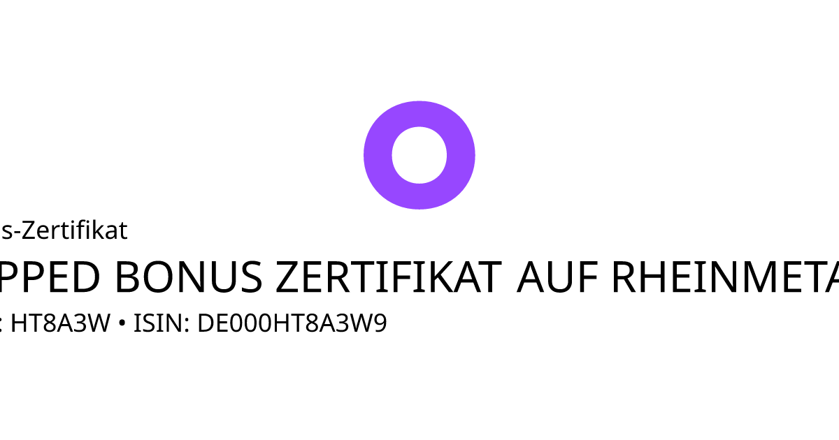 Dieses Capped-Bonus-Zertifikat bezieht sich auf den Basiswert Rheinmetall AG und hat den Fälligkeitstag am 25.09.2026. Das Produkt ist mit einem Sicherheitslevel von 1.450,00 EUR und einem Cap von 2.500,00 EUR ausgestattet. Der Anleger partizipiert unter Berücksichtigung des Bezugsverhältnisses von 0,10 an der Entwicklung des Basiswertes, die Rückzahlung ist allerdings auf maximal 250,00 EUR begrenzt (Cap multipliziert mit dem Bezugsverhältnis). Notiert der Basiswert während des Beobachtungszeitraums vom 12.09.2025 bis zum 18.09.2026 nie auf oder unter dem Sicherheitslevel wird am Ende der Laufzeit mindestens der Bonusbetrag von 250,00 EUR und maximal der Höchstbetrag ausbezahlt.