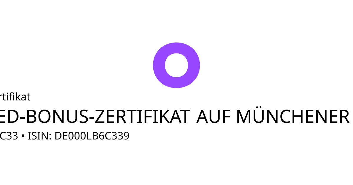 Dieses Capped-Bonus-Zertifikat bezieht sich auf den Basiswert Münchener Rückversicherungs-Gesellschaft AG in München und hat den Fälligkeitstag am 26.06.2026. Das Produkt ist mit einem Sicherheitslevel von 400,00 EUR und einem Cap von 520,00 EUR ausgestattet. Der Anleger partizipiert unter Berücksichtigung des Bezugsverhältnisses von 1,00 an der Entwicklung des Basiswertes, die Rückzahlung ist allerdings auf maximal 520,00 EUR begrenzt (Cap multipliziert mit dem Bezugsverhältnis). Notiert der Basiswert während des Beobachtungszeitraums vom 26.09.2025 bis zum 19.06.2026 nie auf oder unter dem Sicherheitslevel wird am Ende der Laufzeit mindestens der Bonusbetrag von 520,00 EUR und maximal der Höchstbetrag (in bar) ausbezahlt. Andernfalls erfolgt die Rückzahlung in Anteilen des Basiswertes oder eines Referenzwertpapiers.