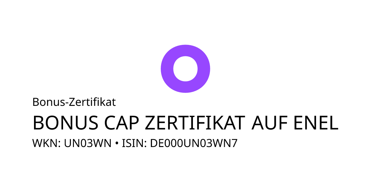 Dieses Capped-Bonus-Zertifikat bezieht sich auf den Basiswert ENEL S.p.A. und hat den Fälligkeitstag am 25.09.2026. Das Produkt ist mit einem Sicherheitslevel von 7,50 EUR und einem Cap von 12,00 EUR ausgestattet. Der Anleger partizipiert unter Berücksichtigung des Bezugsverhältnisses von 1,00 an der Entwicklung des Basiswertes, die Rückzahlung ist allerdings auf maximal 12,00 EUR begrenzt (Cap multipliziert mit dem Bezugsverhältnis). Notiert der Basiswert während des Beobachtungszeitraums vom 26.09.2025 bis zum 18.09.2026 nie auf oder unter dem Sicherheitslevel wird am Ende der Laufzeit mindestens der Bonusbetrag von 12,00 EUR und maximal der Höchstbetrag (in bar) ausbezahlt. Andernfalls erfolgt die Rückzahlung in Anteilen des Basiswertes oder eines Referenzwertpapiers.