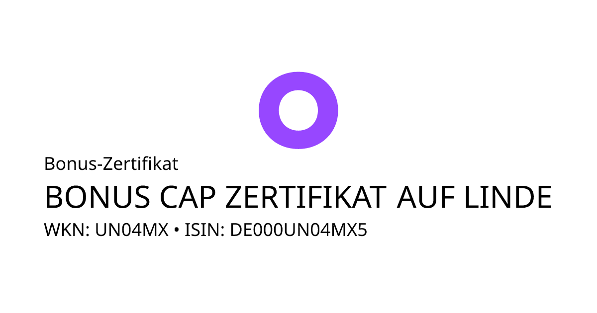 Dieses Capped-Bonus-Zertifikat bezieht sich auf den Basiswert Linde PLC und hat den Fälligkeitstag am 25.09.2026. Das Produkt ist mit einem Sicherheitslevel von 450,00 USD und einem Cap von 850,00 USD ausgestattet. Der Anleger partizipiert unter Berücksichtigung des Bezugsverhältnisses von 1,00 an der Entwicklung des Basiswertes, die Rückzahlung ist allerdings auf maximal 850,00 EUR begrenzt (Cap multipliziert mit dem Bezugsverhältnis). Notiert der Basiswert während des Beobachtungszeitraums vom 26.09.2025 bis zum 18.09.2026 nie auf oder unter dem Sicherheitslevel wird am Ende der Laufzeit mindestens der Bonusbetrag von 850,00 EUR und maximal der Höchstbetrag ausbezahlt.