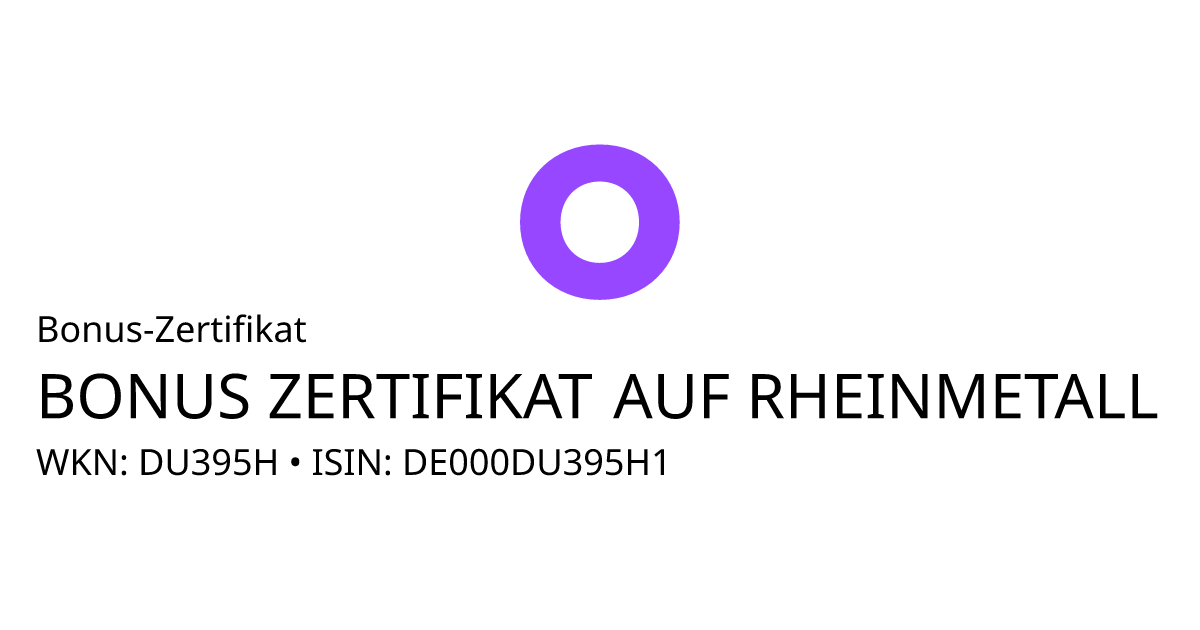 Dieses Bonus-Zertifikat bezieht sich auf den Basiswert Rheinmetall AG und hat den Fälligkeitstag am 24.09.2027. Das Produkt ist mit einem Sicherheitslevel von 1.600,00 EUR ausgestattet. Der Anleger partizipiert unter Berücksichtigung des Bezugsverhältnisses von 1,00 an der Entwicklung des Basiswertes. Notiert der Basiswert während des Beobachtungszeitraums vom 13.10.2025 bis zum 17.09.2027 nie auf oder unter dem Sicherheitslevel wird am Ende der Laufzeit mindestens der Bonusbetrag von 2.400,00 EUR ausbezahlt.