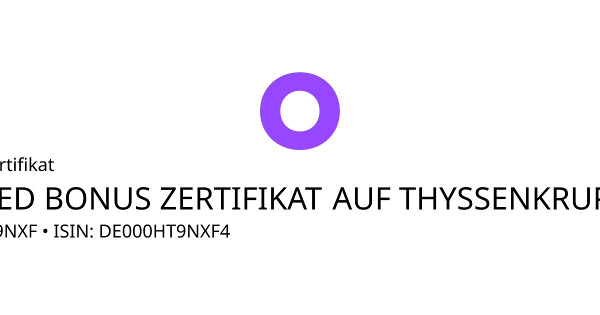 Dieses Capped-Bonus-Zertifikat bezieht sich auf den Basiswert thyssenkrupp AG und hat den Fälligkeitstag am 28.12.2026. Das Produkt ist mit einem Sicherheitslevel von 7,00 EUR und einem Cap von 10,00 EUR ausgestattet. Der Anleger partizipiert unter Berücksichtigung des Bezugsverhältnisses von 1,00 an der Entwicklung des Basiswertes, die Rückzahlung ist allerdings auf maximal 10,00 EUR begrenzt (Cap multipliziert mit dem Bezugsverhältnis). Notiert der Basiswert während des Beobachtungszeitraums vom 05.11.2025 bis zum 18.12.2026 nie auf oder unter dem Sicherheitslevel wird am Ende der Laufzeit mindestens der Bonusbetrag von 10,00 EUR und maximal der Höchstbetrag ausbezahlt.