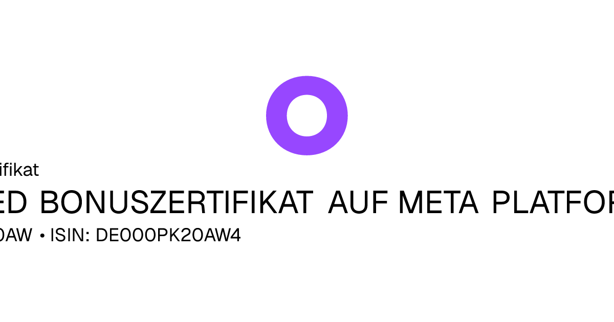 Dieses Capped-Bonus-Zertifikat bezieht sich auf den Basiswert Meta Platforms Inc. und hat den Fälligkeitstag am 23.09.2027. Das Produkt ist mit einem Sicherheitslevel von 450,00 USD und einem Cap von 700,00 USD ausgestattet. Der Anleger partizipiert unter Berücksichtigung des Bezugsverhältnisses von 1,00 an der Entwicklung des Basiswertes, die Rückzahlung ist allerdings auf maximal 700,00 USD begrenzt (Cap multipliziert mit dem Bezugsverhältnis). Notiert der Basiswert während des Beobachtungszeitraums vom 14.11.2025 bis zum 17.09.2027 nie auf oder unter dem Sicherheitslevel wird am Ende der Laufzeit mindestens der Bonusbetrag von 700,00 USD und maximal der Höchstbetrag ausbezahlt.