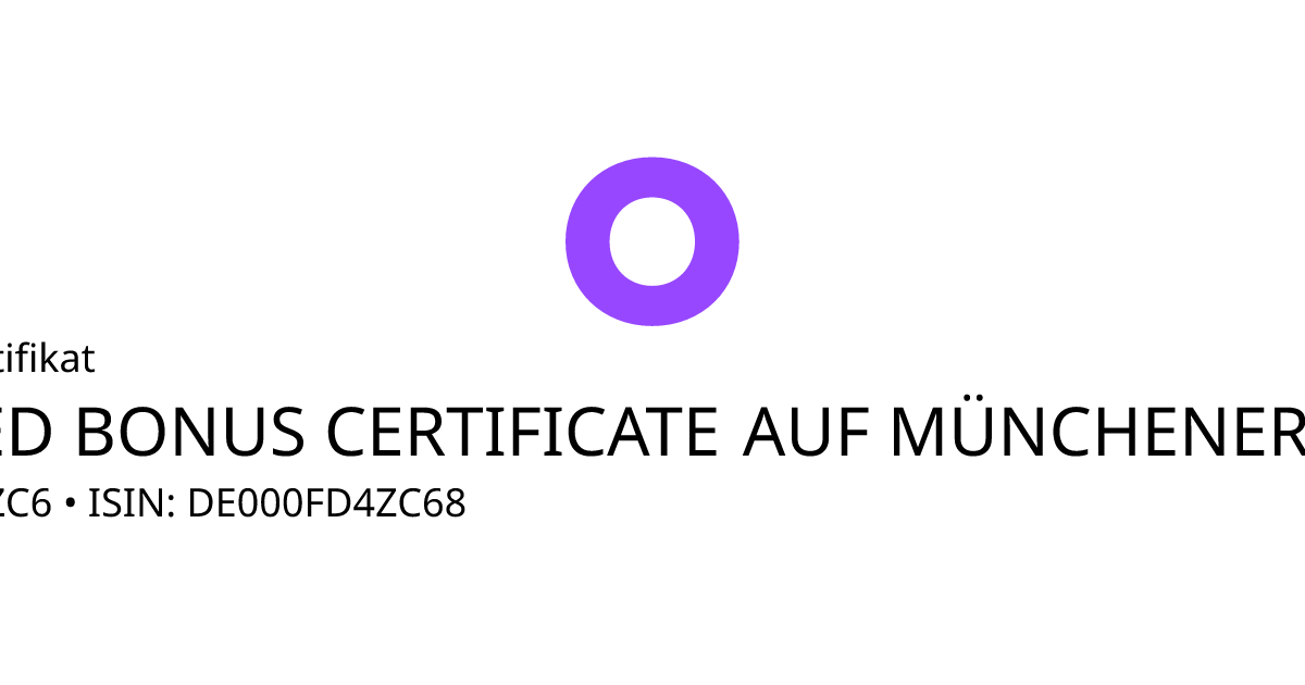 Dieses Capped-Bonus-Zertifikat bezieht sich auf den Basiswert Münchener Rückversicherungs-Gesellschaft AG in München und hat den Fälligkeitstag am 26.03.2027. Das Produkt ist mit einem Sicherheitslevel von 480,00 EUR und einem Cap von 650,00 EUR ausgestattet. Der Anleger partizipiert unter Berücksichtigung des Bezugsverhältnisses von 1,00 an der Entwicklung des Basiswertes, die Rückzahlung ist allerdings auf maximal 650,00 EUR begrenzt (Cap multipliziert mit dem Bezugsverhältnis). Notiert der Basiswert während des Beobachtungszeitraums vom 28.11.2025 bis zum 19.03.2027 nie auf oder unter dem Sicherheitslevel wird am Ende der Laufzeit mindestens der Bonusbetrag von 650,00 EUR und maximal der Höchstbetrag (in bar) ausbezahlt. Andernfalls erfolgt die Rückzahlung in Anteilen des Basiswertes oder eines Referenzwertpapiers.