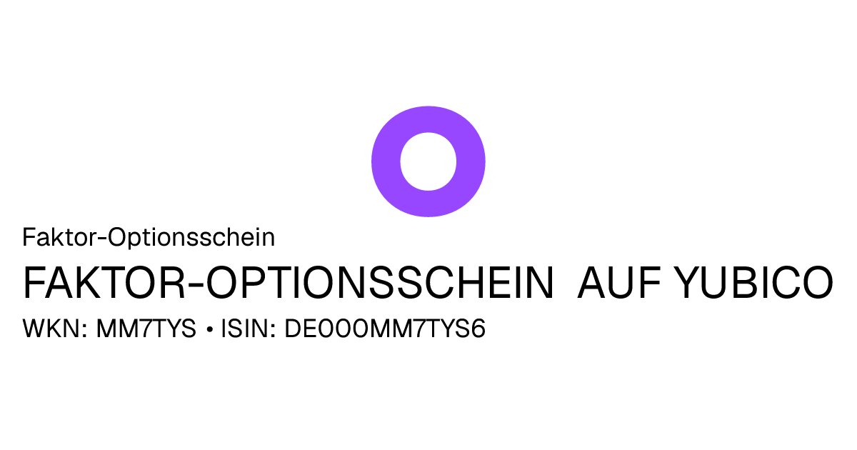 Mit diesem Faktor-Optionsschein partizipiert der Anleger mit einem konstanten Hebel von 3,00 an der positiven und negativen Entwicklung des Basiswertes Yubico AB. Das Produkt hat eine unbegrenzte Laufzeit. Der Emittent hat das Recht das Optionsschein unter Einhaltung einer Frist zu kündigen. Das Produkt ist mit einer Knock-Out Schwelle ausgestattet. Durchbricht der Basiswert während der Laufzeit die Knock-Out Schwelle führt dies zu einer Terminierung des Produkts. Bitte die Angaben in den Endgültigen Bedingungen beachten.