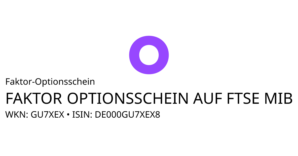 Mit diesem Faktor-Optionsschein partizipiert der Anleger mit einem konstanten Hebel von 20,00 an der positiven und negativen Entwicklung des Basiswertes FTSE MIB IDX. Das Produkt hat eine unbegrenzte Laufzeit. Der Emittent hat das Recht das Optionsschein unter Einhaltung einer Frist zu kündigen. Das Produkt ist mit einer Knock-Out Schwelle ausgestattet. Durchbricht der Basiswert während der Laufzeit die Knock-Out Schwelle führt dies zu einer Terminierung des Produkts. Bitte die Angaben in den Endgültigen Bedingungen beachten.