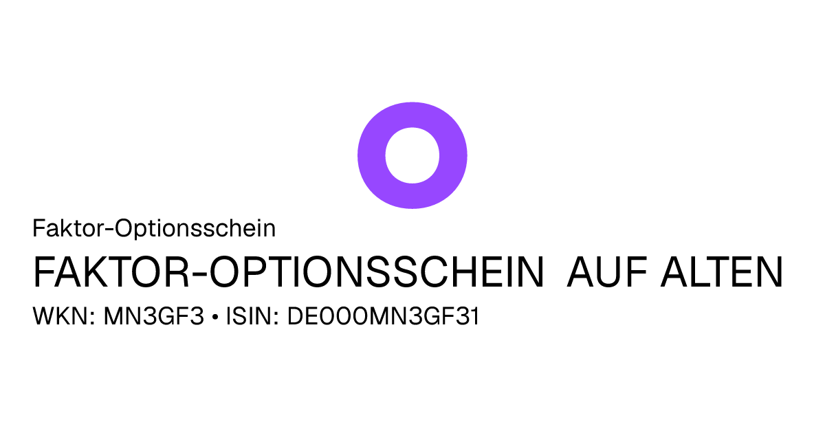 Mit diesem Faktor-Optionsschein partizipiert der Anleger mit einem konstanten Hebel von 3,00 an der positiven und negativen Entwicklung des Basiswertes Alten S.A.. Das Produkt hat eine unbegrenzte Laufzeit. Der Emittent hat das Recht das Optionsschein unter Einhaltung einer Frist zu kündigen. Das Produkt ist mit einer Knock-Out Schwelle ausgestattet. Durchbricht der Basiswert während der Laufzeit die Knock-Out Schwelle führt dies zu einer Terminierung des Produkts. Bitte die Angaben in den Endgültigen Bedingungen beachten.
