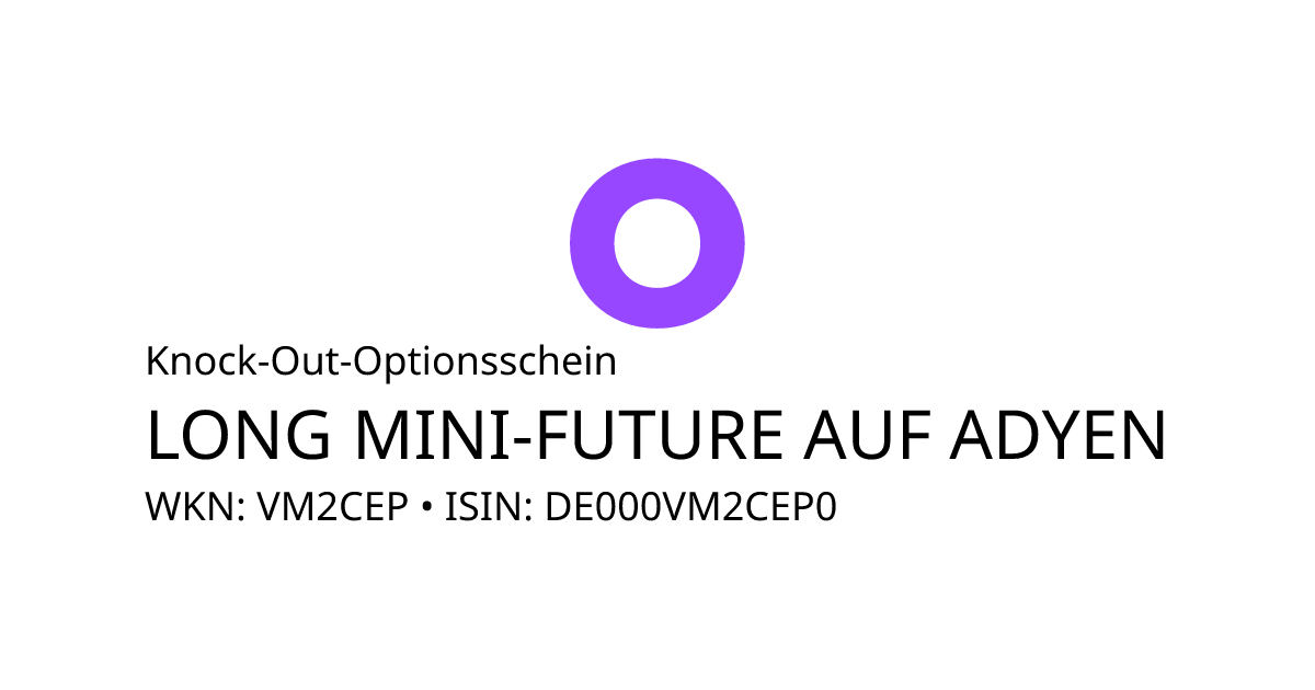 Dieser Open-End Knock-Out Optionsschein mit Stop-Loss (Call) bezieht sich auf den Basiswert Adyen B.V. und hat eine unbegrenzte Laufzeit. Es handelt sich um ein Hebelprodukt, d.h. der Anleger partizipiert überproportional an der positiven und negativen Entwicklung des Basiswertes. Das Produkt ist mit einer Knock-Out Schwelle bei 579,92 EUR ausgestattet. Durchbricht der Basiswert während der Laufzeit die Knock-Out Schwelle wird das Produkt ausgeknockt und unmittelbar zum Restwert zurückbezahlt. Der Anleger hat während der Laufzeit ein Ausübungsrecht. Bei Ausübung berechnet sich die Rückzahlung durch die Differenz zwischen dem Kurs des Basiswertes und dem Basispreis von 552,98 EUR bereinigt um das Bezugsverhältnis von 0,01. Der Emittent hat das Recht den Optionsschein unter Einhaltung einer Frist zu kündigen.