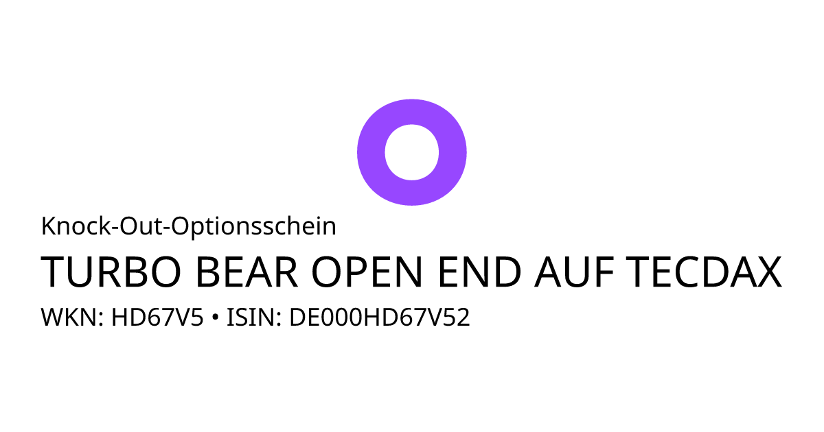 Dieser Open-End Knock-Out Optionsschein (Put) bezieht sich auf den Basiswert TecDAX Performance-Index und hat eine unbegrenzte Laufzeit. Es handelt sich um ein Hebelprodukt, d.h. der Anleger partizipiert überproportional an der positiven und negativen Entwicklung des Basiswertes. Das Produkt ist mit einer Knock-Out Schwelle bei 4.007,87 Punkte ausgestattet. Durchbricht der Basiswert während der Laufzeit die Knock-Out Schwelle wird das Produkt ausgeknockt und verfällt sofort wertlos. Der Anleger hat während der Laufzeit an festgelegten Terminen ein Ausübungsrecht. Bei Ausübung berechnet sich die Rückzahlung durch die Differenz zwischen dem Basispreis von 4.007,87 Punkte und dem Kurs des Basiswertes bereinigt um das Bezugsverhältnis von 0,01. Der Emittent hat das Recht den Optionsschein unter Einhaltung einer Frist zu kündigen.
