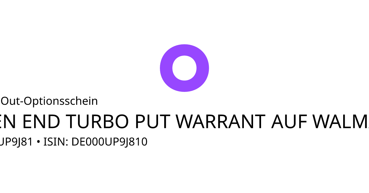 Dieser Open-End Knock-Out Optionsschein (Put) bezieht sich auf den Basiswert Walmart Inc. und hat eine unbegrenzte Laufzeit. Es handelt sich um ein Hebelprodukt, d.h. der Anleger partizipiert überproportional an der positiven und negativen Entwicklung des Basiswertes. Das Produkt ist mit einer Knock-Out Schwelle bei 124,01942 USD ausgestattet. Durchbricht der Basiswert während der Laufzeit die Knock-Out Schwelle wird das Produkt ausgeknockt und verfällt sofort wertlos. Der Anleger hat während der Laufzeit an festgelegten Terminen ein Ausübungsrecht. Bei Ausübung berechnet sich die Rückzahlung durch die Differenz zwischen dem Basispreis von 124,01942 USD und dem Kurs des Basiswertes bereinigt um das Bezugsverhältnis von 0,10. Der Emittent hat das Recht den Optionsschein unter Einhaltung einer Frist zu kündigen.