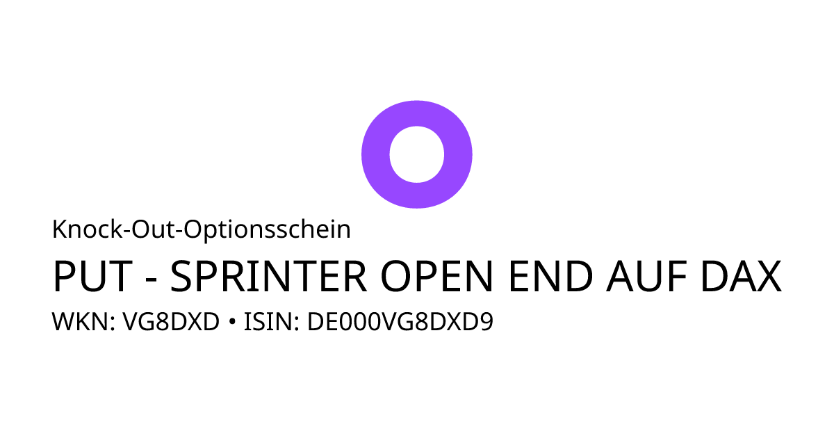 Dieser Open-End Knock-Out Optionsschein (Put) bezieht sich auf den Basiswert DAX und hat eine unbegrenzte Laufzeit. Es handelt sich um ein Hebelprodukt, d.h. der Anleger partizipiert überproportional an der positiven und negativen Entwicklung des Basiswertes. Das Produkt ist mit einer Knock-Out Schwelle bei 26.853,0729 Punkte ausgestattet. Durchbricht der Basiswert während der Laufzeit die Knock-Out Schwelle wird das Produkt ausgeknockt und verfällt sofort wertlos. Der Anleger hat während der Laufzeit ein Ausübungsrecht. Bei Ausübung berechnet sich die Rückzahlung durch die Differenz zwischen dem Basispreis von 26.853,0729 Punkte und dem Kurs des Basiswertes bereinigt um das Bezugsverhältnis von 0,01. Der Emittent hat das Recht den Optionsschein unter Einhaltung einer Frist zu kündigen.