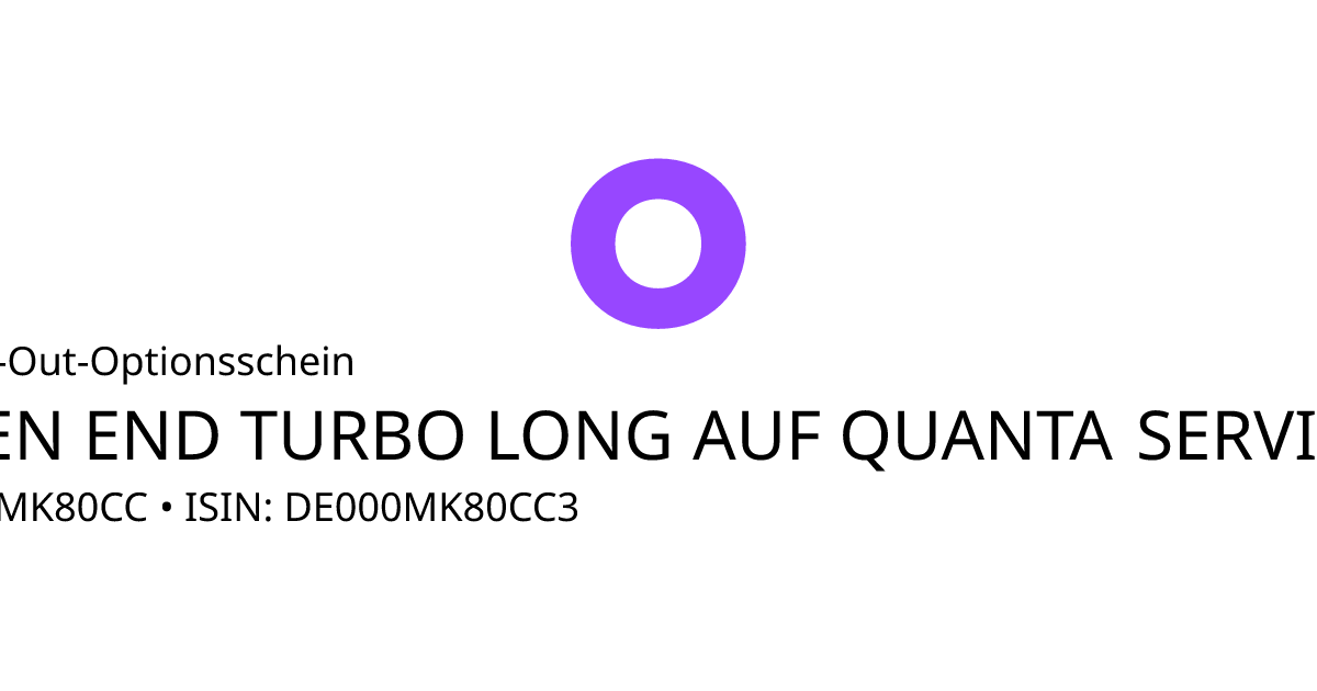 Dieser Open-End Knock-Out Optionsschein (Call) bezieht sich auf den Basiswert Quanta Services Inc. und hat eine unbegrenzte Laufzeit. Es handelt sich um ein Hebelprodukt, d.h. der Anleger partizipiert überproportional an der positiven und negativen Entwicklung des Basiswertes. Das Produkt ist mit einer Knock-Out Schwelle bei 354,7926 USD ausgestattet. Durchbricht der Basiswert während der Laufzeit die Knock-Out Schwelle wird das Produkt ausgeknockt und verfällt sofort wertlos. Der Anleger hat während der Laufzeit ein Ausübungsrecht. Bei Ausübung berechnet sich die Rückzahlung durch die Differenz zwischen dem Kurs des Basiswertes und dem Basispreis von 354,7926 USD bereinigt um das Bezugsverhältnis von 0,10. Der Emittent hat das Recht den Optionsschein unter Einhaltung einer Frist zu kündigen.
