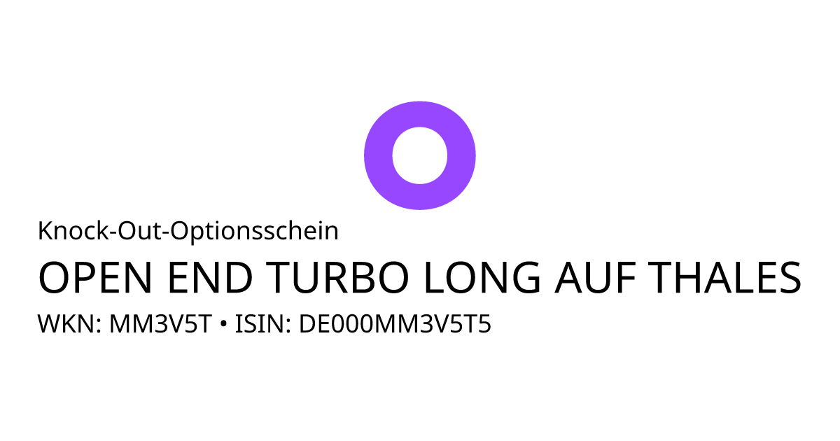 Dieser Open-End Knock-Out Optionsschein (Call) bezieht sich auf den Basiswert Thales S.A. und hat eine unbegrenzte Laufzeit. Es handelt sich um ein Hebelprodukt, d.h. der Anleger partizipiert überproportional an der positiven und negativen Entwicklung des Basiswertes. Das Produkt ist mit einer Knock-Out Schwelle bei 231,3017 EUR ausgestattet. Durchbricht der Basiswert während der Laufzeit die Knock-Out Schwelle wird das Produkt ausgeknockt und verfällt sofort wertlos. Der Anleger hat während der Laufzeit ein Ausübungsrecht. Bei Ausübung berechnet sich die Rückzahlung durch die Differenz zwischen dem Kurs des Basiswertes und dem Basispreis von 231,3017 EUR bereinigt um das Bezugsverhältnis von 0,10. Der Emittent hat das Recht den Optionsschein unter Einhaltung einer Frist zu kündigen.