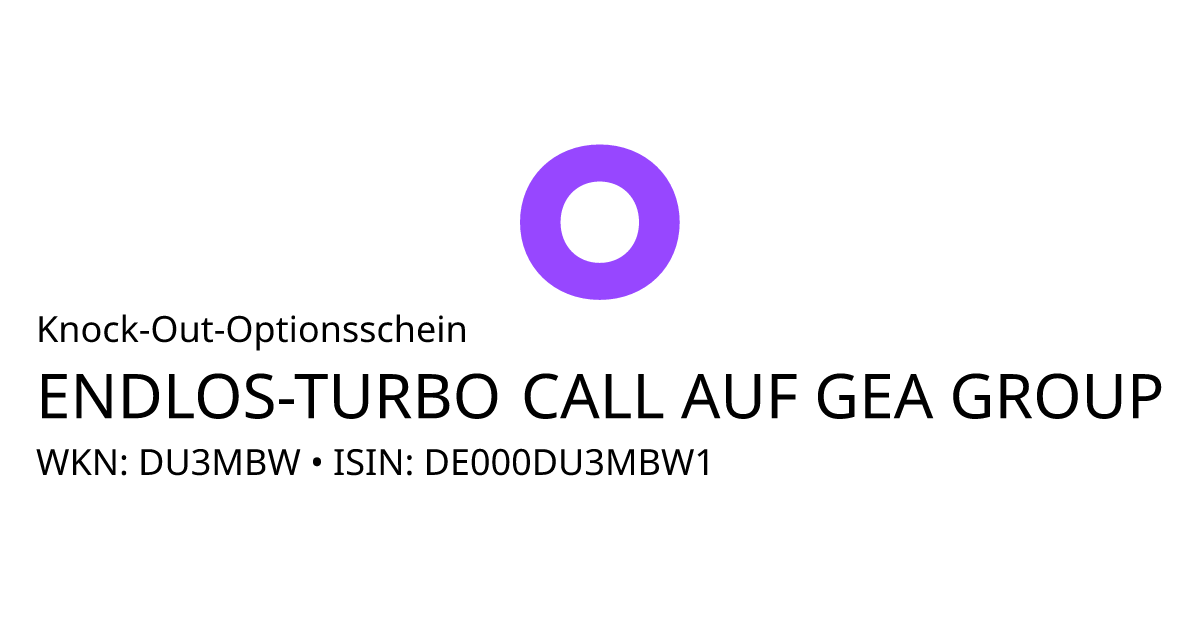 Dieser Open-End Knock-Out Optionsschein (Call) bezieht sich auf den Basiswert GEA Group AG und hat eine unbegrenzte Laufzeit. Es handelt sich um ein Hebelprodukt, d.h. der Anleger partizipiert überproportional an der positiven und negativen Entwicklung des Basiswertes. Das Produkt ist mit einer Knock-Out Schwelle bei 61,0444 EUR ausgestattet. Durchbricht der Basiswert während der Laufzeit die Knock-Out Schwelle wird das Produkt ausgeknockt und verfällt sofort wertlos. Der Anleger hat während der Laufzeit an festgelegten Terminen ein Ausübungsrecht. Bei Ausübung berechnet sich die Rückzahlung durch die Differenz zwischen dem Kurs des Basiswertes und dem Basispreis von 61,0444 EUR bereinigt um das Bezugsverhältnis von 0,10. Der Emittent hat das Recht den Optionsschein unter Einhaltung einer Frist zu kündigen.