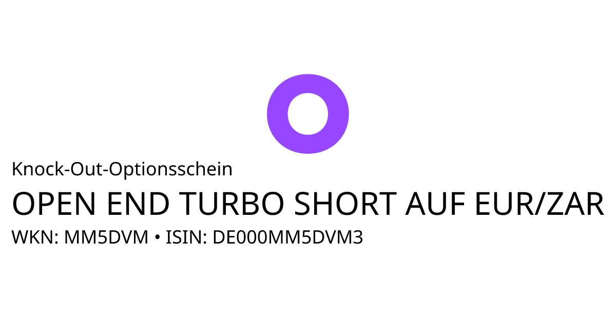 Dieser Open-End Knock-Out Optionsschein (Put) bezieht sich auf den Basiswert EUR/ZAR und hat eine unbegrenzte Laufzeit. Es handelt sich um ein Hebelprodukt, d.h. der Anleger partizipiert überproportional an der positiven und negativen Entwicklung des Basiswertes. Das Produkt ist mit einer Knock-Out Schwelle bei 21,3752 ZAR ausgestattet. Durchbricht der Basiswert während der Laufzeit die Knock-Out Schwelle wird das Produkt ausgeknockt und verfällt sofort wertlos. Der Anleger hat während der Laufzeit ein Ausübungsrecht. Bei Ausübung berechnet sich die Rückzahlung durch die Differenz zwischen dem Basispreis von 21,3752 ZAR und dem Kurs des Basiswertes bereinigt um das Bezugsverhältnis von 100,00. Der Emittent hat das Recht den Optionsschein unter Einhaltung einer Frist zu kündigen.