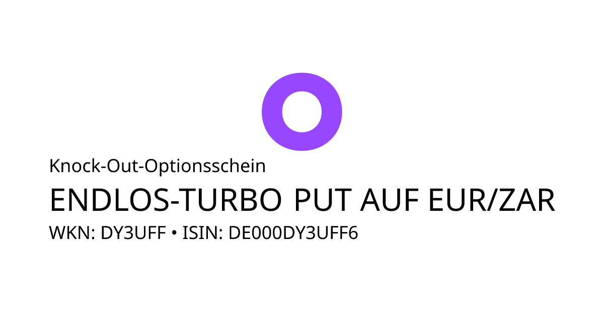 Dieser Open-End Knock-Out Optionsschein (Put) bezieht sich auf den Basiswert EUR/ZAR und hat eine unbegrenzte Laufzeit. Es handelt sich um ein Hebelprodukt, d.h. der Anleger partizipiert überproportional an der positiven und negativen Entwicklung des Basiswertes. Das Produkt ist mit einer Knock-Out Schwelle bei 20,3627 ZAR ausgestattet. Durchbricht der Basiswert während der Laufzeit die Knock-Out Schwelle wird das Produkt ausgeknockt und verfällt sofort wertlos. Der Anleger hat während der Laufzeit an festgelegten Terminen ein Ausübungsrecht. Bei Ausübung berechnet sich die Rückzahlung durch die Differenz zwischen dem Basispreis von 20,3627 ZAR und dem Kurs des Basiswertes bereinigt um das Bezugsverhältnis von 100,00. Der Emittent hat das Recht den Optionsschein unter Einhaltung einer Frist zu kündigen.