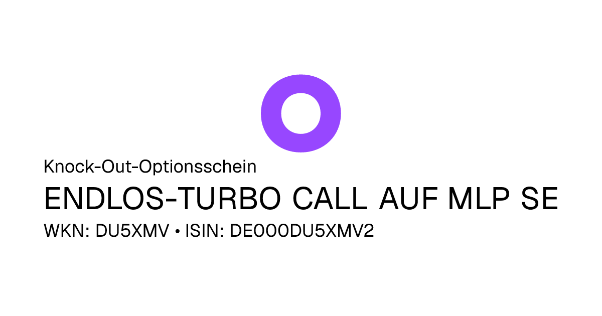 Dieser Open-End Knock-Out Optionsschein (Call) bezieht sich auf den Basiswert MLP SE und hat eine unbegrenzte Laufzeit. Es handelt sich um ein Hebelprodukt, d.h. der Anleger partizipiert überproportional an der positiven und negativen Entwicklung des Basiswertes. Das Produkt ist mit einer Knock-Out Schwelle bei 6,3858 EUR ausgestattet. Durchbricht der Basiswert während der Laufzeit die Knock-Out Schwelle wird das Produkt ausgeknockt und verfällt sofort wertlos. Der Anleger hat während der Laufzeit an festgelegten Terminen ein Ausübungsrecht. Bei Ausübung berechnet sich die Rückzahlung durch die Differenz zwischen dem Kurs des Basiswertes und dem Basispreis von 6,3858 EUR bereinigt um das Bezugsverhältnis von 1,00. Der Emittent hat das Recht den Optionsschein unter Einhaltung einer Frist zu kündigen.