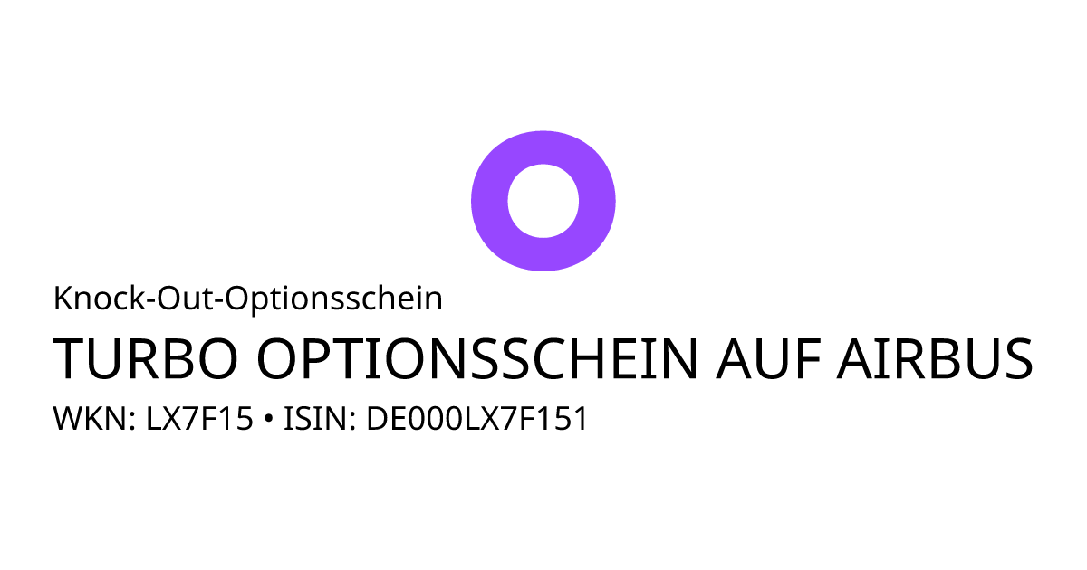 Dieser Knock-Out Optionsschein (Call) bezieht sich auf den Basiswert Airbus SE und hat den Fälligkeitstag am 23.06.2026. Es handelt sich um ein Hebelprodukt, d.h. der Anleger partizipiert überproportional an der positiven und negativen Entwicklung des Basiswertes. Das Produkt ist mit einer Knock-Out Schwelle bei 190,00 EUR ausgestattet. Durchbricht der Basiswert während der Laufzeit die Knock-Out Schwelle wird das Produkt ausgeknockt und verfällt sofort wertlos. Notiert der Kurs des Basiswertes am Ende der Laufzeit über dem Basispreis von 190,00 EUR, berechnet sich die Rückzahlung durch die Differenz zwischen dem Kurs des Basiswertes und dem Basispreis bereinigt um das Bezugsverhältnis von 0,10.