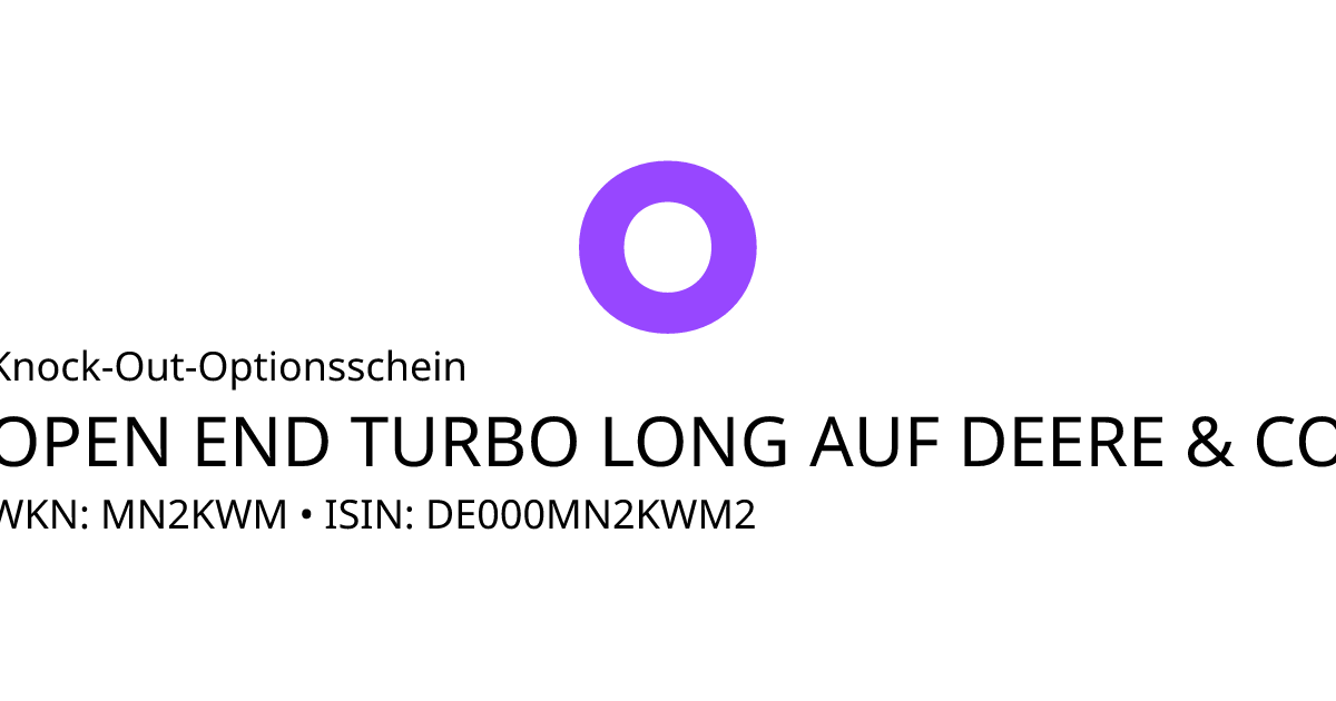 Dieser Open-End Knock-Out Optionsschein (Call) bezieht sich auf den Basiswert Deere & Co. und hat eine unbegrenzte Laufzeit. Es handelt sich um ein Hebelprodukt, d.h. der Anleger partizipiert überproportional an der positiven und negativen Entwicklung des Basiswertes. Das Produkt ist mit einer Knock-Out Schwelle bei 525,6227 USD ausgestattet. Durchbricht der Basiswert während der Laufzeit die Knock-Out Schwelle wird das Produkt ausgeknockt und verfällt sofort wertlos. Der Anleger hat während der Laufzeit ein Ausübungsrecht. Bei Ausübung berechnet sich die Rückzahlung durch die Differenz zwischen dem Kurs des Basiswertes und dem Basispreis von 525,6227 USD bereinigt um das Bezugsverhältnis von 0,01. Der Emittent hat das Recht den Optionsschein unter Einhaltung einer Frist zu kündigen.