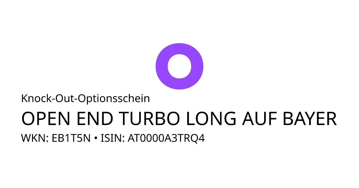 Dieser Open-End Knock-Out Optionsschein mit Stop-Loss (Call) bezieht sich auf den Basiswert Bayer AG und hat eine unbegrenzte Laufzeit. Es handelt sich um ein Hebelprodukt, d.h. der Anleger partizipiert überproportional an der positiven und negativen Entwicklung des Basiswertes. Das Produkt ist mit einer Knock-Out Schwelle bei 36,03 EUR ausgestattet. Durchbricht der Basiswert während der Laufzeit die Knock-Out Schwelle wird das Produkt ausgeknockt und unmittelbar zum Restwert zurückbezahlt. Der Anleger hat während der Laufzeit ein Ausübungsrecht. Bei Ausübung berechnet sich die Rückzahlung durch die Differenz zwischen dem Kurs des Basiswertes und dem Basispreis von 35,03 EUR bereinigt um das Bezugsverhältnis von 0,10. Der Emittent hat das Recht den Optionsschein unter Einhaltung einer Frist zu kündigen.