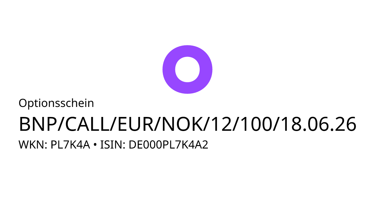 Dieser Optionsschein (Call) bezieht sich auf den Basiswert EUR/NOK und hat den Fälligkeitstag am 24.06.2026. Es handelt sich um ein Hebelprodukt, d.h. der Anleger partizipiert überproportional an der positiven und negativen Entwicklung des Basiswertes. Steht der Kurs des Basiswertes am Ende der Laufzeit über dem Basispreis von 12,00 NOK, berechnet sich die Rückzahlung durch die Differenz zwischen dem Kurs des Basiswertes und dem Basispreis bereinigt um das Bezugsverhältnis von 100,00. Andernfalls verfällt das Produkt wertlos.