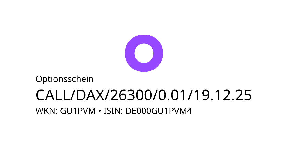 Dieser Optionsschein (Call) bezieht sich auf den Basiswert DAX und hat den Fälligkeitstag am 24.12.2025. Es handelt sich um ein Hebelprodukt, d.h. der Anleger partizipiert überproportional an der positiven und negativen Entwicklung des Basiswertes. Steht der Kurs des Basiswertes am Ende der Laufzeit über dem Basispreis von 26.300,00 Punkte, berechnet sich die Rückzahlung durch die Differenz zwischen dem Kurs des Basiswertes und dem Basispreis bereinigt um das Bezugsverhältnis von 0,01. Andernfalls verfällt das Produkt wertlos.