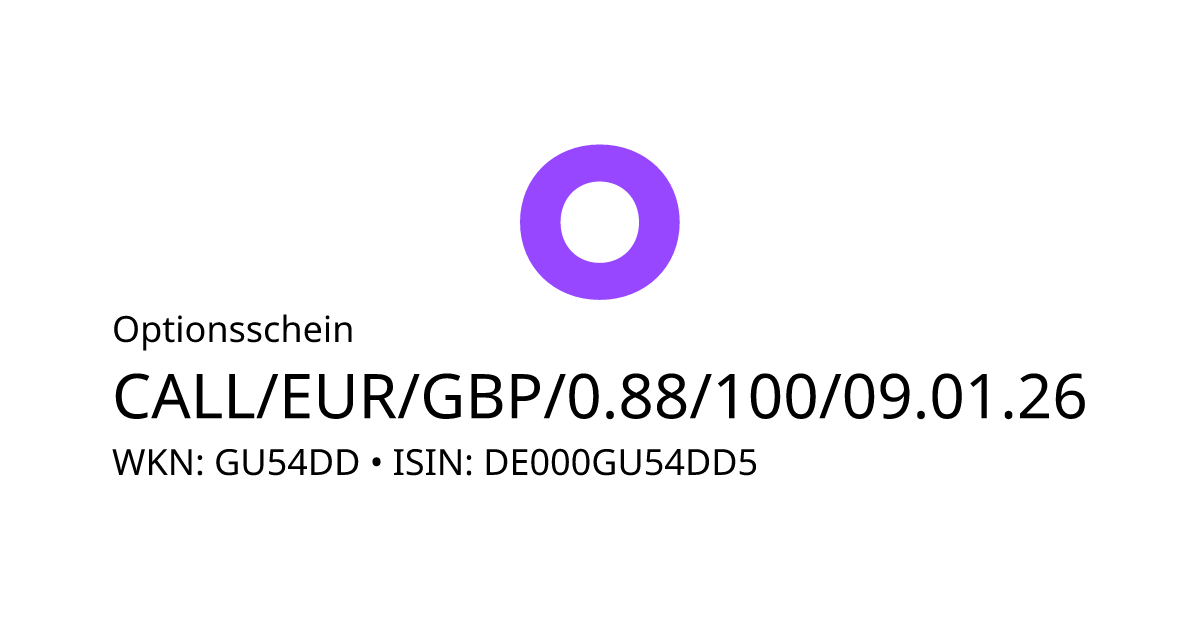 Dieser Optionsschein (Call) bezieht sich auf den Basiswert EUR/GBP und hat den Fälligkeitstag am 14.01.2026. Es handelt sich um ein Hebelprodukt, d.h. der Anleger partizipiert überproportional an der positiven und negativen Entwicklung des Basiswertes. Steht der Kurs des Basiswertes am Ende der Laufzeit über dem Basispreis von 0,88 GBP, berechnet sich die Rückzahlung durch die Differenz zwischen dem Kurs des Basiswertes und dem Basispreis bereinigt um das Bezugsverhältnis von 100,00. Andernfalls verfällt das Produkt wertlos.