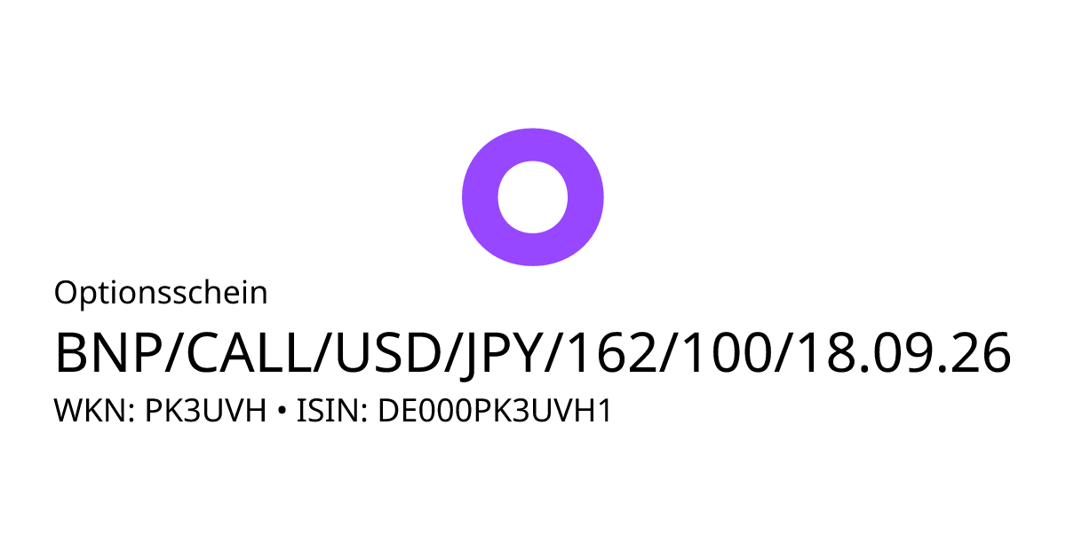 Dieser Optionsschein (Call) bezieht sich auf den Basiswert USD/JPY und hat den Fälligkeitstag am 24.09.2026. Es handelt sich um ein Hebelprodukt, d.h. der Anleger partizipiert überproportional an der positiven und negativen Entwicklung des Basiswertes. Steht der Kurs des Basiswertes am Ende der Laufzeit über dem Basispreis von 162,00 JPY, berechnet sich die Rückzahlung durch die Differenz zwischen dem Kurs des Basiswertes und dem Basispreis bereinigt um das Bezugsverhältnis von 100,00. Andernfalls verfällt das Produkt wertlos.
