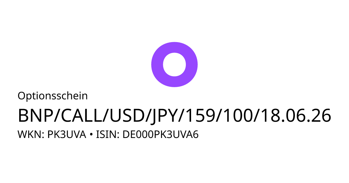 Dieser Optionsschein (Call) bezieht sich auf den Basiswert USD/JPY und hat den Fälligkeitstag am 24.06.2026. Es handelt sich um ein Hebelprodukt, d.h. der Anleger partizipiert überproportional an der positiven und negativen Entwicklung des Basiswertes. Steht der Kurs des Basiswertes am Ende der Laufzeit über dem Basispreis von 159,00 JPY, berechnet sich die Rückzahlung durch die Differenz zwischen dem Kurs des Basiswertes und dem Basispreis bereinigt um das Bezugsverhältnis von 100,00. Andernfalls verfällt das Produkt wertlos.