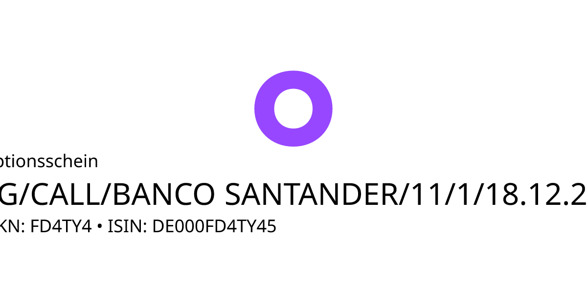 Dieser Optionsschein (Call) bezieht sich auf den Basiswert Banco Santander S.A. und hat den Fälligkeitstag am 28.12.2026. Es handelt sich um ein Hebelprodukt, d.h. der Anleger partizipiert überproportional an der positiven und negativen Entwicklung des Basiswertes. Der Anleger hat während der Laufzeit ein Ausübungsrecht. Bei Ausübung berechnet sich die Rückzahlung durch die Differenz zwischen dem Kurs des Basiswertes und dem Basispreis bereinigt um das Bezugsverhältnis von 1,00. Am Ende der Laufzeit kommt es zu einer automatischen Ausübung. Liegt der Kurs des Basiswertes dann unterhalb des Basispreises, verfällt das Produkt wertlos.