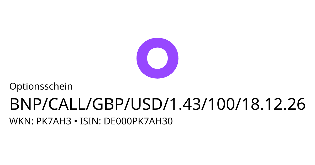 Dieser Optionsschein (Call) bezieht sich auf den Basiswert GBP/USD und hat den Fälligkeitstag am 24.12.2026. Es handelt sich um ein Hebelprodukt, d.h. der Anleger partizipiert überproportional an der positiven und negativen Entwicklung des Basiswertes. Steht der Kurs des Basiswertes am Ende der Laufzeit über dem Basispreis von 1,43 USD, berechnet sich die Rückzahlung durch die Differenz zwischen dem Kurs des Basiswertes und dem Basispreis bereinigt um das Bezugsverhältnis von 100,00. Andernfalls verfällt das Produkt wertlos.