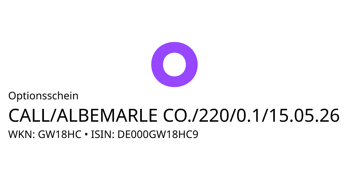 Dieser Optionsschein (Call) bezieht sich auf den Basiswert Albemarle Corp. und hat den Fälligkeitstag am 20.05.2026. Es handelt sich um ein Hebelprodukt, d.h. der Anleger partizipiert überproportional an der positiven und negativen Entwicklung des Basiswertes. Der Anleger hat während der Laufzeit ein Ausübungsrecht. Bei Ausübung berechnet sich die Rückzahlung durch die Differenz zwischen dem Kurs des Basiswertes und dem Basispreis bereinigt um das Bezugsverhältnis von 0,10. Am Ende der Laufzeit kommt es zu einer automatischen Ausübung. Liegt der Kurs des Basiswertes dann unterhalb des Basispreises, verfällt das Produkt wertlos.