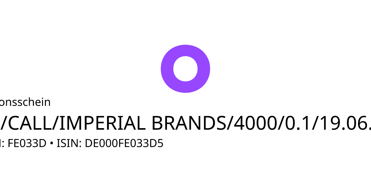 Dieser Optionsschein (Call) bezieht sich auf den Basiswert Imperial Brands PLC und hat den Fälligkeitstag am 26.06.2026. Es handelt sich um ein Hebelprodukt, d.h. der Anleger partizipiert überproportional an der positiven und negativen Entwicklung des Basiswertes. Der Anleger hat während der Laufzeit ein Ausübungsrecht. Bei Ausübung berechnet sich die Rückzahlung durch die Differenz zwischen dem Kurs des Basiswertes und dem Basispreis bereinigt um das Bezugsverhältnis von 0,10. Am Ende der Laufzeit kommt es zu einer automatischen Ausübung. Liegt der Kurs des Basiswertes dann unterhalb des Basispreises, verfällt das Produkt wertlos.