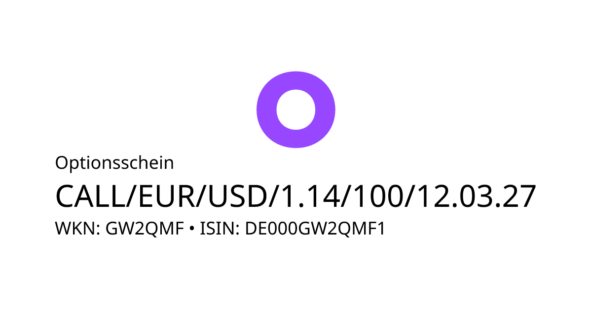 Dieser Optionsschein (Call) bezieht sich auf den Basiswert EUR/USD und hat den Fälligkeitstag am 17.03.2027. Es handelt sich um ein Hebelprodukt, d.h. der Anleger partizipiert überproportional an der positiven und negativen Entwicklung des Basiswertes. Steht der Kurs des Basiswertes am Ende der Laufzeit über dem Basispreis von 1,14 USD, berechnet sich die Rückzahlung durch die Differenz zwischen dem Kurs des Basiswertes und dem Basispreis bereinigt um das Bezugsverhältnis von 100,00. Andernfalls verfällt das Produkt wertlos.