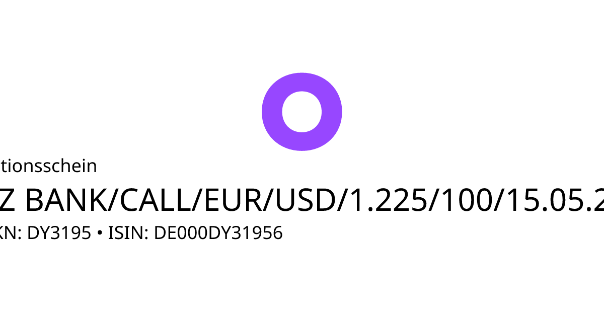 Dieser Optionsschein (Call) bezieht sich auf den Basiswert EUR/USD und hat den Fälligkeitstag am 22.05.2026. Es handelt sich um ein Hebelprodukt, d.h. der Anleger partizipiert überproportional an der positiven und negativen Entwicklung des Basiswertes. Steht der Kurs des Basiswertes am Ende der Laufzeit über dem Basispreis von 1,225 USD, berechnet sich die Rückzahlung durch die Differenz zwischen dem Kurs des Basiswertes und dem Basispreis bereinigt um das Bezugsverhältnis von 100,00. Andernfalls verfällt das Produkt wertlos.