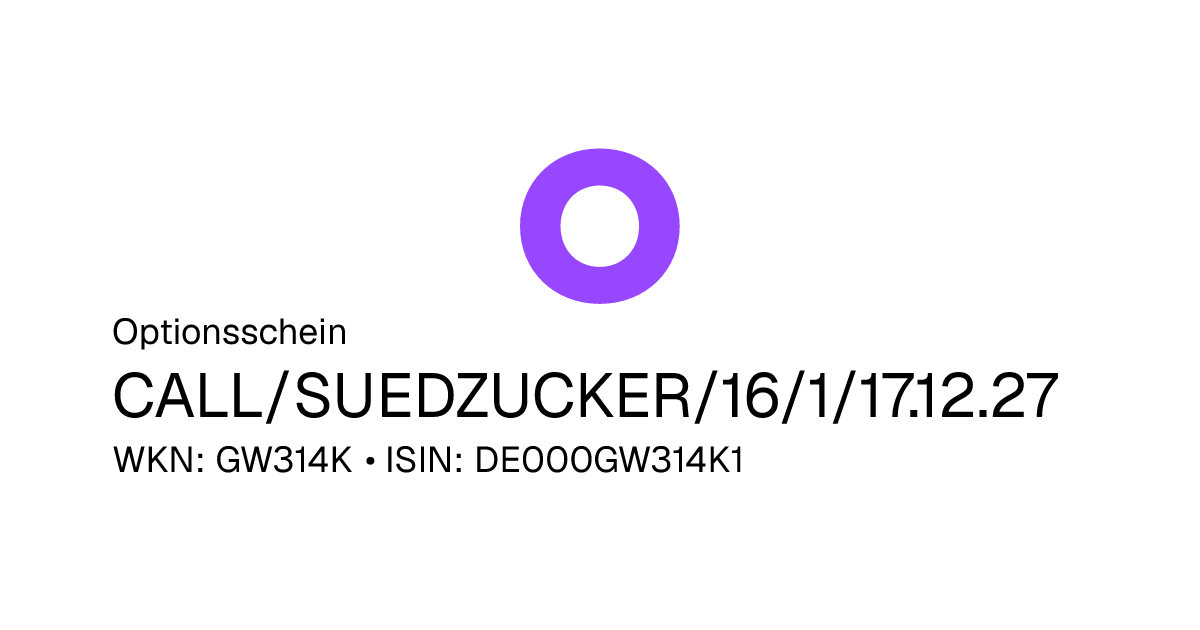 Dieser Optionsschein (Call) bezieht sich auf den Basiswert Südzucker AG und hat den Fälligkeitstag am 22.12.2027. Es handelt sich um ein Hebelprodukt, d.h. der Anleger partizipiert überproportional an der positiven und negativen Entwicklung des Basiswertes. Der Anleger hat während der Laufzeit ein Ausübungsrecht. Bei Ausübung berechnet sich die Rückzahlung durch die Differenz zwischen dem Kurs des Basiswertes und dem Basispreis bereinigt um das Bezugsverhältnis von 1,00. Am Ende der Laufzeit kommt es zu einer automatischen Ausübung. Liegt der Kurs des Basiswertes dann unterhalb des Basispreises, verfällt das Produkt wertlos.