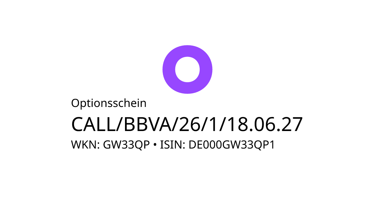 Dieser Optionsschein (Call) bezieht sich auf den Basiswert Banco Bilbao Vizcaya Argentaria S.A. (BBVA) und hat den Fälligkeitstag am 23.06.2027. Es handelt sich um ein Hebelprodukt, d.h. der Anleger partizipiert überproportional an der positiven und negativen Entwicklung des Basiswertes. Der Anleger hat während der Laufzeit ein Ausübungsrecht. Bei Ausübung berechnet sich die Rückzahlung durch die Differenz zwischen dem Kurs des Basiswertes und dem Basispreis bereinigt um das Bezugsverhältnis von 1,00. Am Ende der Laufzeit kommt es zu einer automatischen Ausübung. Liegt der Kurs des Basiswertes dann unterhalb des Basispreises, verfällt das Produkt wertlos.