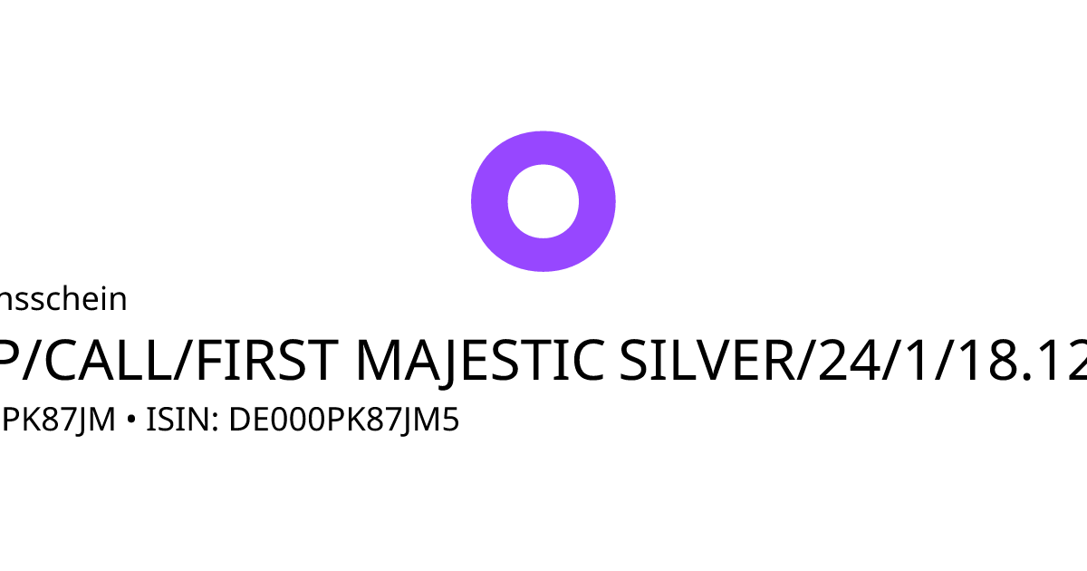Dieser Optionsschein (Call) bezieht sich auf den Basiswert First Majestic Silver Corp. und hat den Fälligkeitstag am 24.12.2026. Es handelt sich um ein Hebelprodukt, d.h. der Anleger partizipiert überproportional an der positiven und negativen Entwicklung des Basiswertes. Der Anleger hat während der Laufzeit ein Ausübungsrecht. Bei Ausübung berechnet sich die Rückzahlung durch die Differenz zwischen dem Kurs des Basiswertes und dem Basispreis bereinigt um das Bezugsverhältnis von 1,00. Am Ende der Laufzeit kommt es zu einer automatischen Ausübung. Liegt der Kurs des Basiswertes dann unterhalb des Basispreises, verfällt das Produkt wertlos.