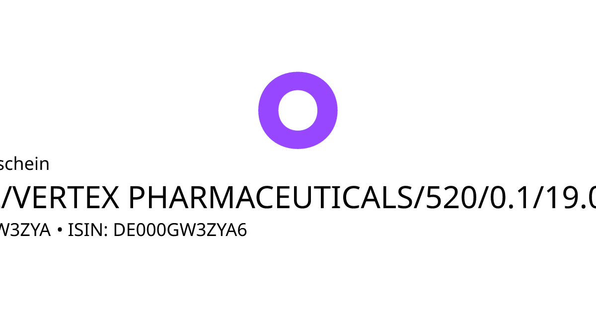 Dieser Optionsschein (Call) bezieht sich auf den Basiswert Vertex Pharmaceuticals Inc. und hat den Fälligkeitstag am 24.03.2027. Es handelt sich um ein Hebelprodukt, d.h. der Anleger partizipiert überproportional an der positiven und negativen Entwicklung des Basiswertes. Der Anleger hat während der Laufzeit ein Ausübungsrecht. Bei Ausübung berechnet sich die Rückzahlung durch die Differenz zwischen dem Kurs des Basiswertes und dem Basispreis bereinigt um das Bezugsverhältnis von 0,10. Am Ende der Laufzeit kommt es zu einer automatischen Ausübung. Liegt der Kurs des Basiswertes dann unterhalb des Basispreises, verfällt das Produkt wertlos.
