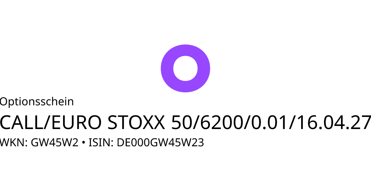 Dieser Optionsschein (Call) bezieht sich auf den Basiswert EURO STOXX 50 und hat den Fälligkeitstag am 21.04.2027. Es handelt sich um ein Hebelprodukt, d.h. der Anleger partizipiert überproportional an der positiven und negativen Entwicklung des Basiswertes. Steht der Kurs des Basiswertes am Ende der Laufzeit über dem Basispreis von 6.200,00 Punkte, berechnet sich die Rückzahlung durch die Differenz zwischen dem Kurs des Basiswertes und dem Basispreis bereinigt um das Bezugsverhältnis von 0,01. Andernfalls verfällt das Produkt wertlos.