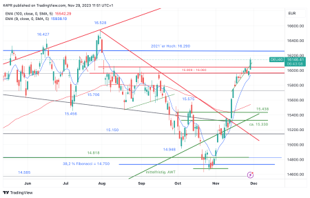 Im Handelstakt zum Mittwoch ergab sich sogar exakt um 16.000 Punkten eine kleine Kurslücke, das Tageshoch wurde bislang bei 16.172 Punkten markiert und liegt damit weit außerhalb der Widerstandszone von 15.909-16.060 Punkten. Offenbar können es Marktteilnehmer nicht abwarten, das Barometer noch in diesem Jahr auf frische Rekordniveaus zu hieven.