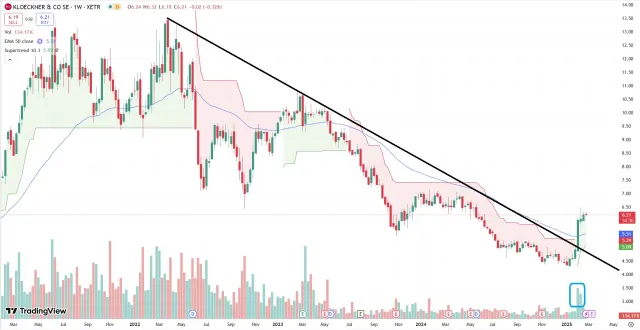 Unter den größten Wochenumsätzen auf Xetra (türkis im Chart oben) seit zwei Jahren brach die Klöckner-Aktie Anfang Februar aus dem mehrjährigen Abwärtstrend (schwarz) im Wochenchart nach oben aus und generierte damit ein prozyklisches Kaufsignal. Der Supertrend-Indikator drehte ebenfalls auf "Kaufen" im Wochenchart.