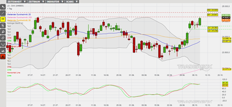 Mit dem gestern erfolgten Breakout aus der engen, mehrtägigen Seitwärtsrange konnten die Bullen einen wichtigen Etappensieg verbuchen. Damit sollte der DAX nun die Basis für eine Fortsetzung der am 17. November gestarteten Aufwärtsbewegung entlang des sich nach oben weitenden Bollinger-Bands gelegt haben. Für dieses Szenario spricht neben den weiter bestehenden Kaufsignalen des GD200, des GD20 und des GD50 auch das neu getriggerte Kaufsignal in der Slow-Stochastik.