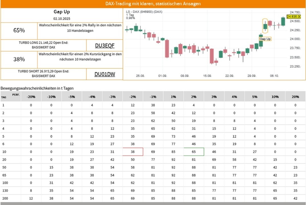 Die Erfolgswahrscheinlichkeiten für das Signal „Gap Up“ beruhen auf einer historischen Auswertung des Signals auf den LS-DAX im Zeitraum vom 02.01.2000 bis zum 08.10.2025. Dabei wurden die folgenden Voreinstellungen und Filter vorgenommen: