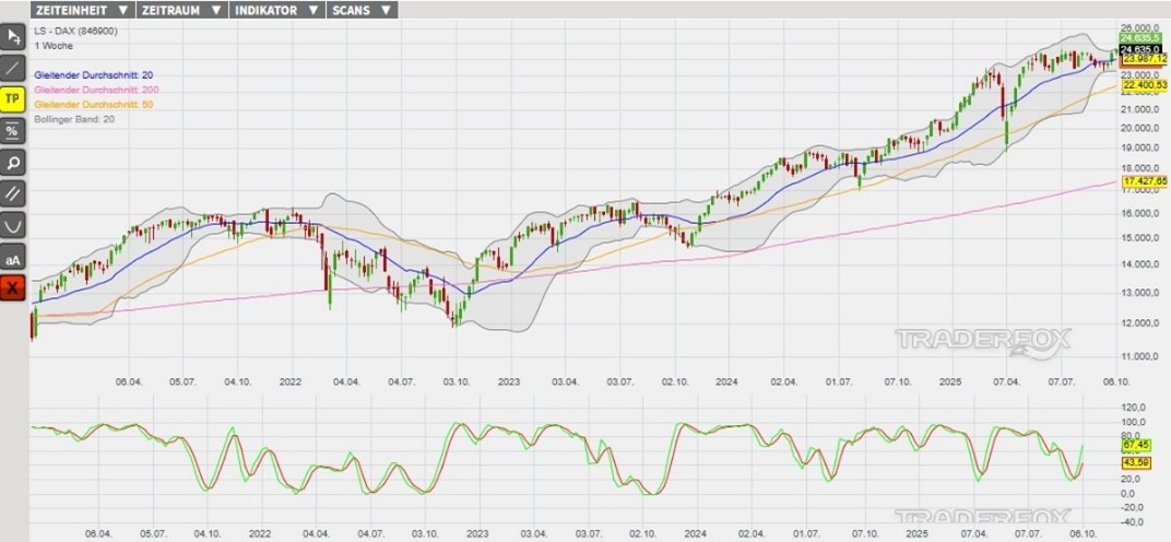 Der Chart zeigt die Entwicklung des Indikators der Slow Stochastik in der Vergangenheit. Zukünftige Ergebnisse können sowohl niedriger als auch höher ausfallen. Eine Kerze im Chart entspricht einer Börsenwoche. Quelle: https://www.dzbank-wertpapiere.de/markets/daxanalyse
