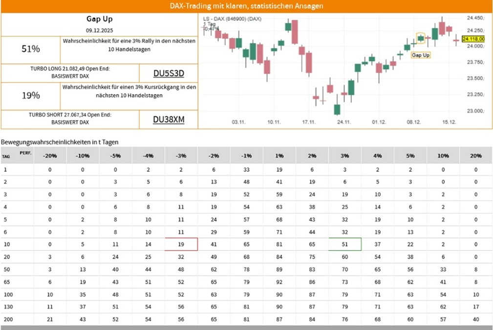 Die Erfolgswahrscheinlichkeiten für das Signal „Gap Up“ beruhen auf einer historischen Auswertung des Signals auf den LS-DAX im Zeitraum vom 02.01.2000 bis zum 16.12.2025. Dabei wurden die folgenden Voreinstellungen und Filter vorgenommen: