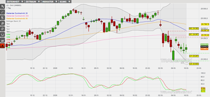 In den letzten Wochen hat der Verkaufsdruck zugenommen und eine untergeordnete Abwärtstrendstruktur hat sich im Chart etabliert. Ausgehend vom lokalen Maximum am 27. Februar bei 25.405 Punkten ist der Index dabei bis zum lokalen Minimum am 9. März bei 22.922 Punkten um 2.483 Punkte eingebrochen. Unterhalb des Bollinger-Bandes im überverkauften Bereich zeigten sich dann erste Erholungstendenzen, welche den Index wiederum bis zum 10. März auf ein niedrigeres Verlaufshoch führten. Belastend wirken derzeit insbesondere die Verkaufssignale in der überverkauften Slow Stochastik und jene Verkaufssignale der gleitenden Durchschnitte der letzten 20, 50 sowie 200 Börsentage (= GD 20, GD 50 sowie GD 200). Sollte der Index nach der Zwischenerholung die nächste Verkaufswelle vorbereiten, dann könnten neue lokale Minima ins Visier genommen werden.