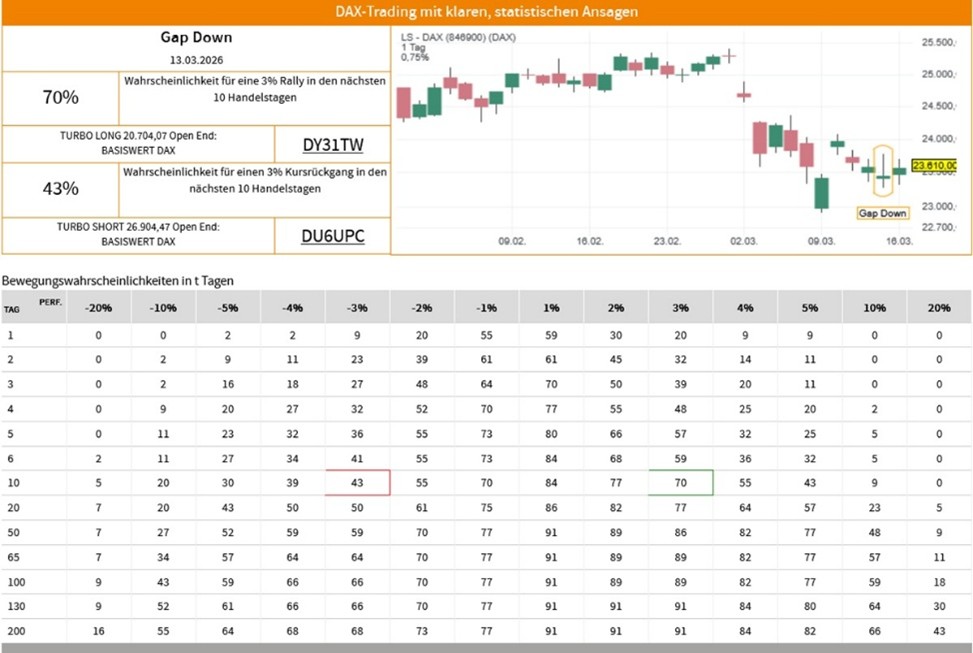 Die Erfolgswahrscheinlichkeiten für das Signal „Gap Down“ beruhen auf einer historischen Auswertung des Signals auf den LS-DAX im Zeitraum vom 02.01.2000 bis zum 16.03.2026. Dabei wurden die folgenden Voreinstellungen und Filter vorgenommen: